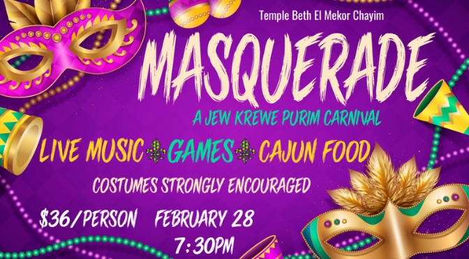 You’re invited to the most exciting Mardi Gras party around! Join us for a night of dancing and merriment with a 6-piece Dixieland band, kosher cajun food, and adult carnival games.